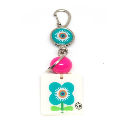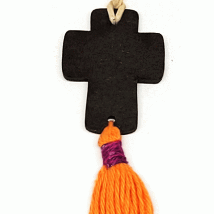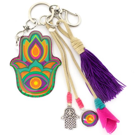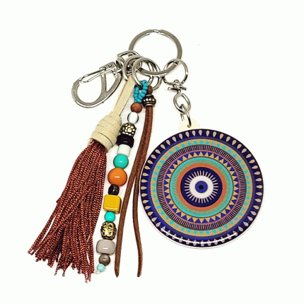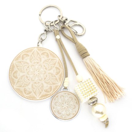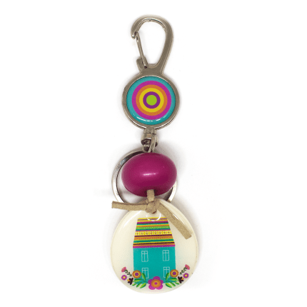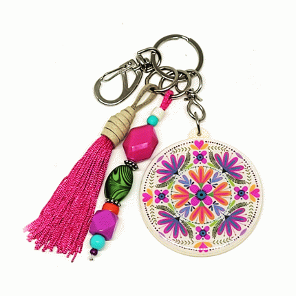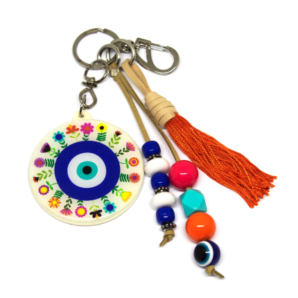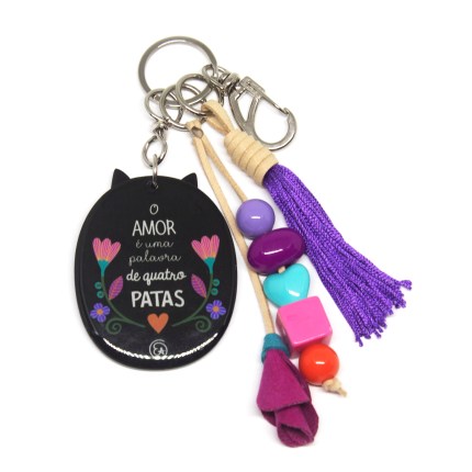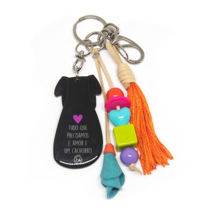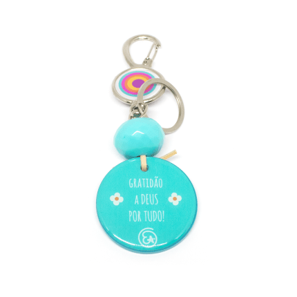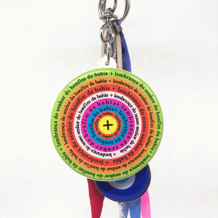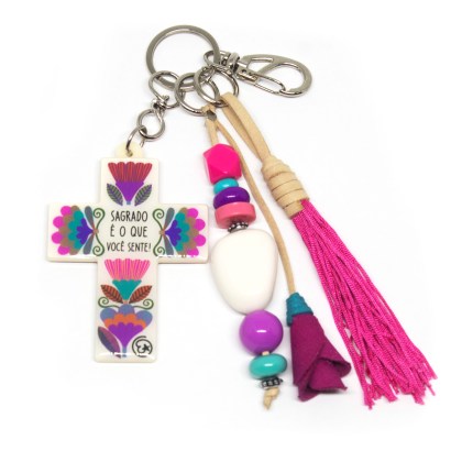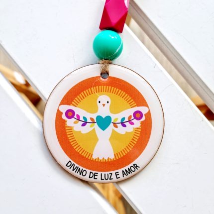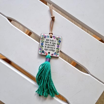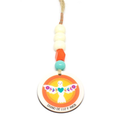Pingentes de MDF resinados amarrados com barbante e contas coloridas.