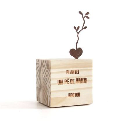 Bloco de madeira clara em forma de casinha, com impressão de frase e detalhe em ferro envelhecido