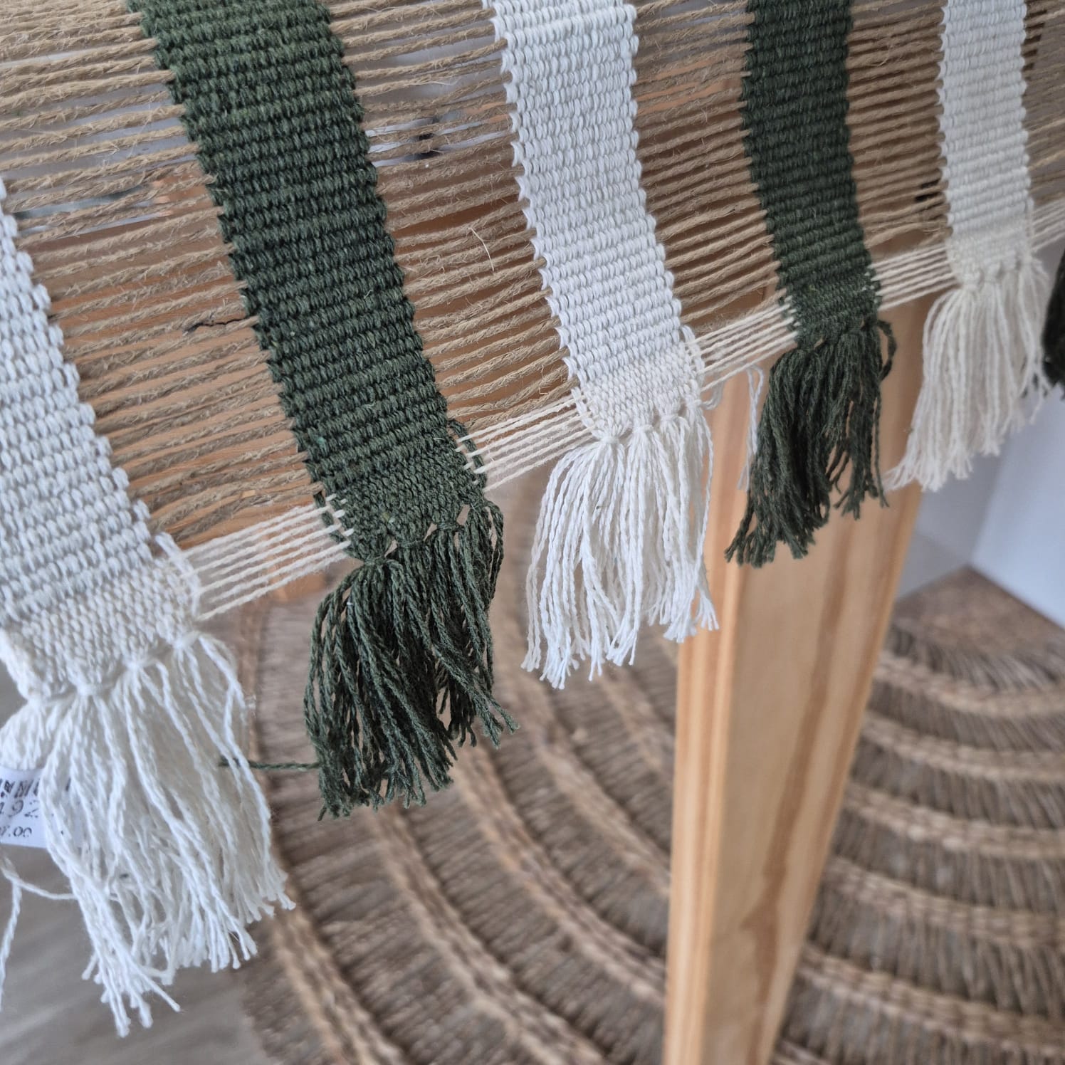 Caminho de mesa 1m verde musgo de fibra rami artesanal no tear mineiro