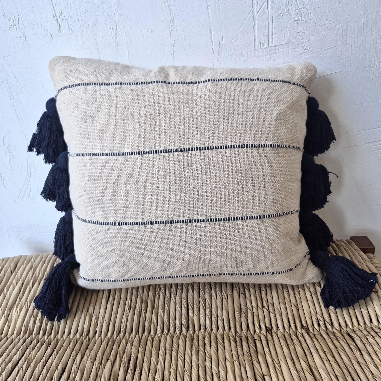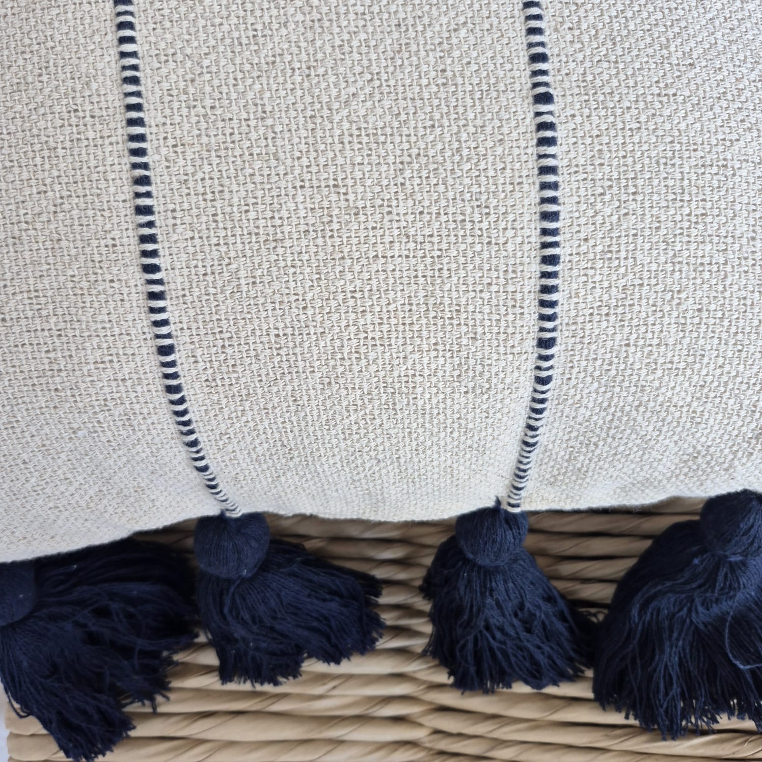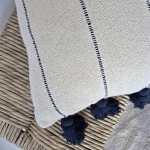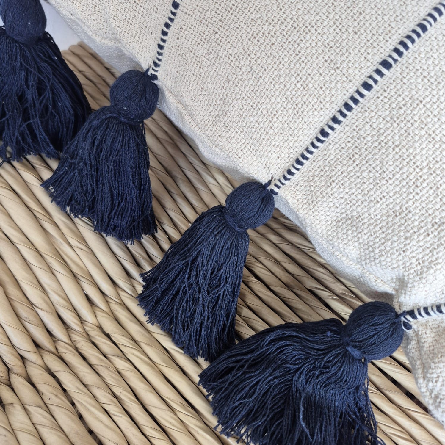 Capa de almofada decorativa azul marinho com pompom lateral artesanal 45×45