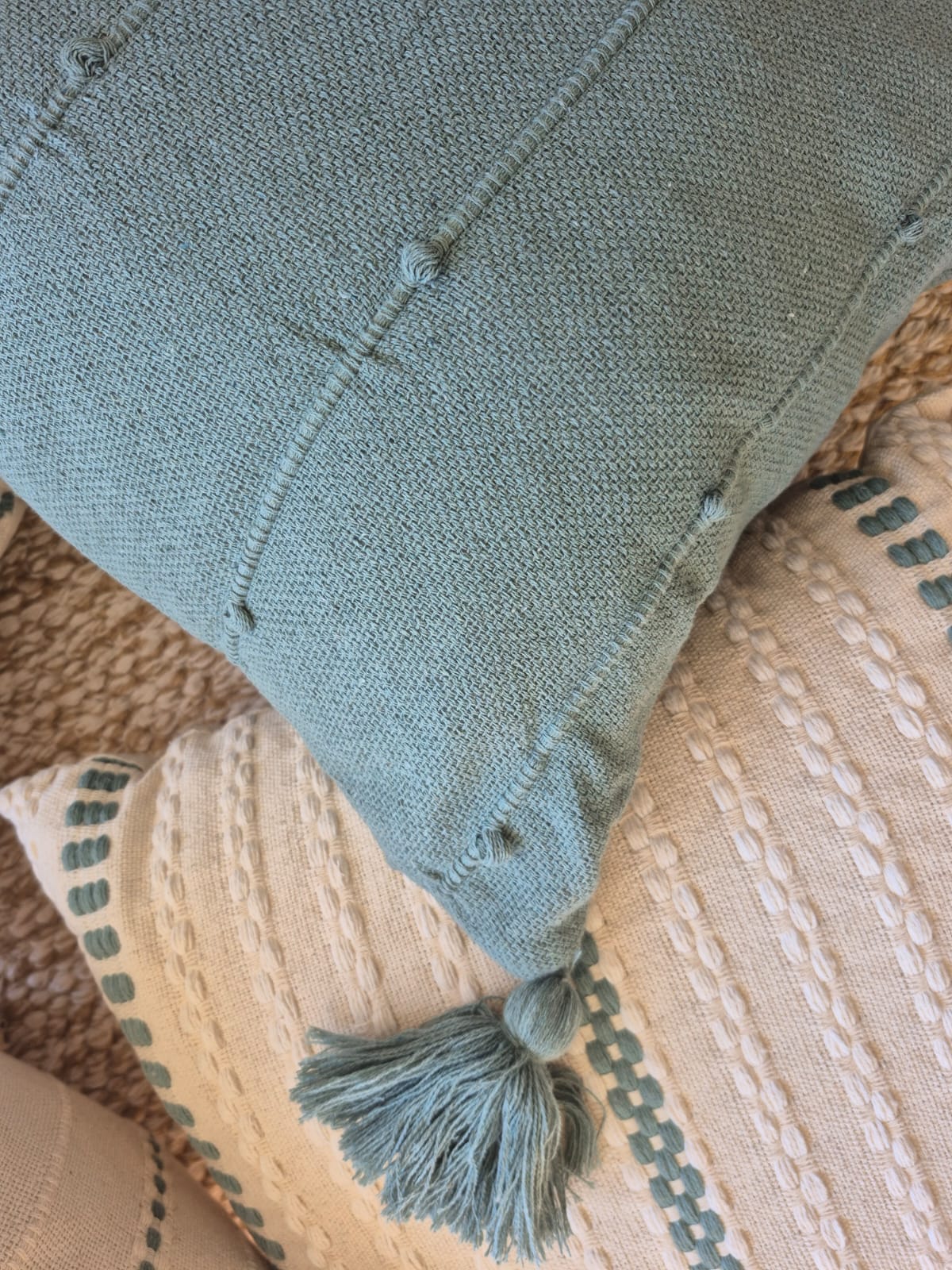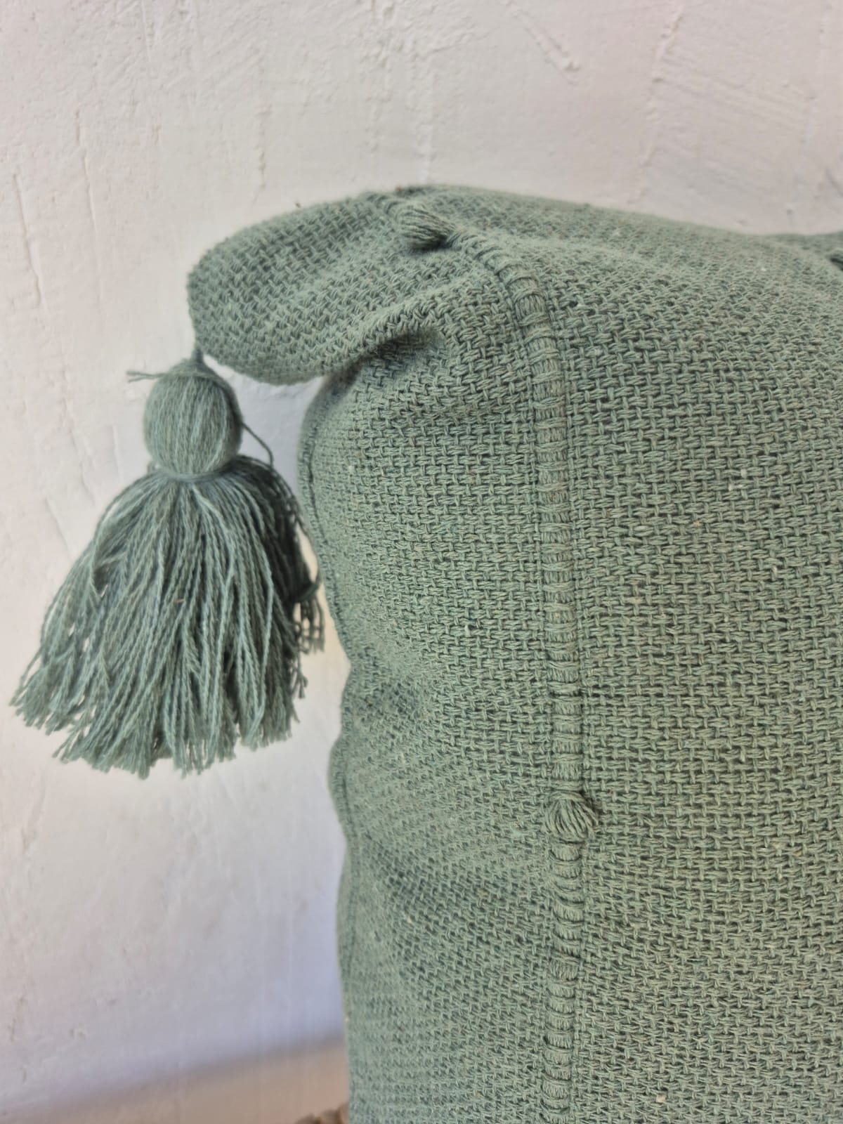 Capa de almofada decorativa verde água fio puxado com pompom artesanal 45×45