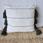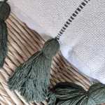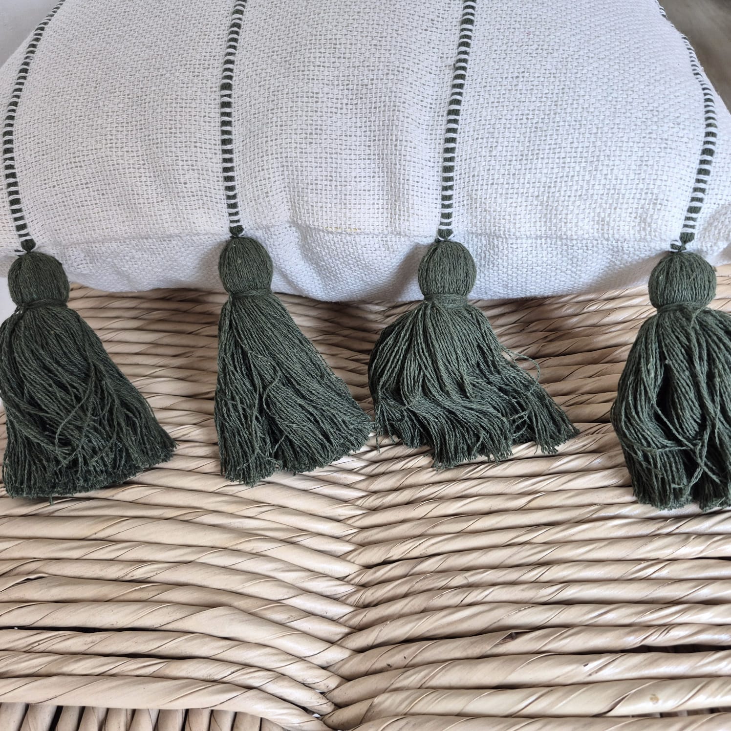 Capa de almofada decorativa verde musgo com pompom na lateral artesanal 45×45