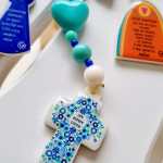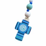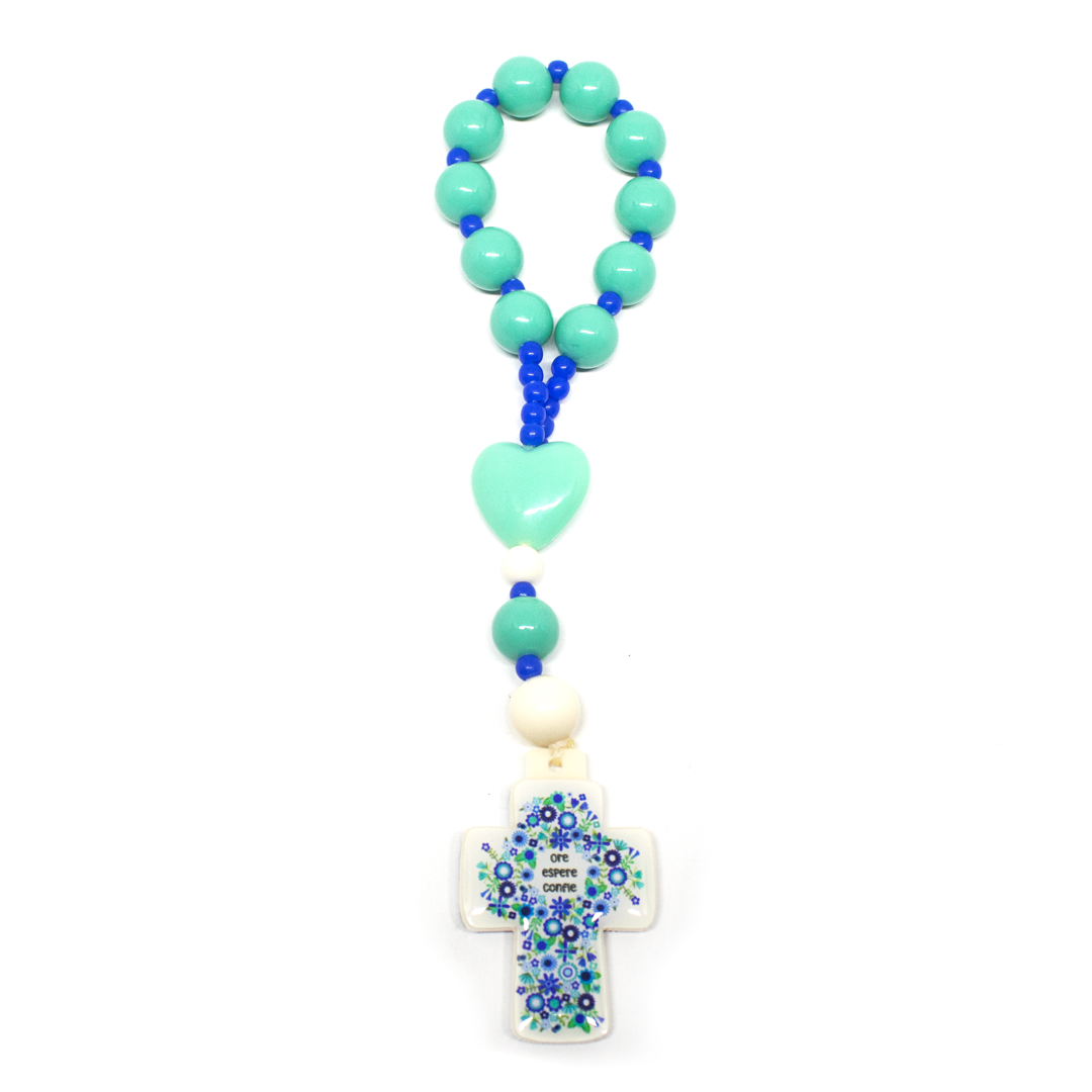 Acessório com crucifixo em MDF resinado, contas de madeira e miçangas coloridas. Nossos TERÇOS e DEZENAS tem mensagens de fé e devoção que vão te encantar.