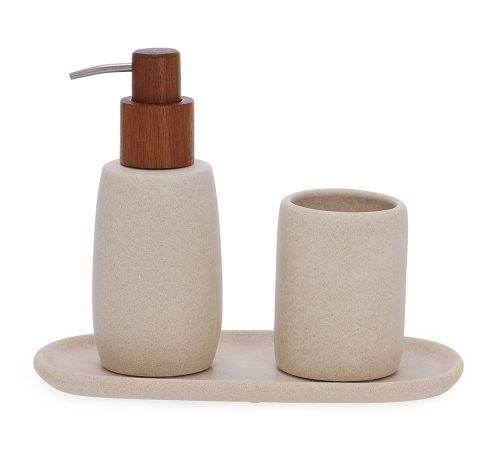 Tamanho: PORTA-SABONETE LÍQUIDO 17,5 x 7 / COPO 9 x 7 cm  / BANDEJA 1,5 x 23,5 x 12 cm