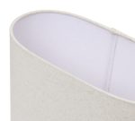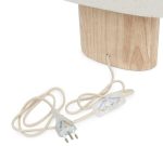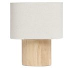 A base robusta e cilíndrica é feita em madeira clara que injeta uma dose de calor e orgânico no seu espaço, a cúpula é revestida em tecido texturizado claro de linho que difunde a luz de forma suave, criando uma atmosfera relaxante e livre de ofuscamento – ideal para leitura e momentos de descanso.
