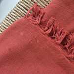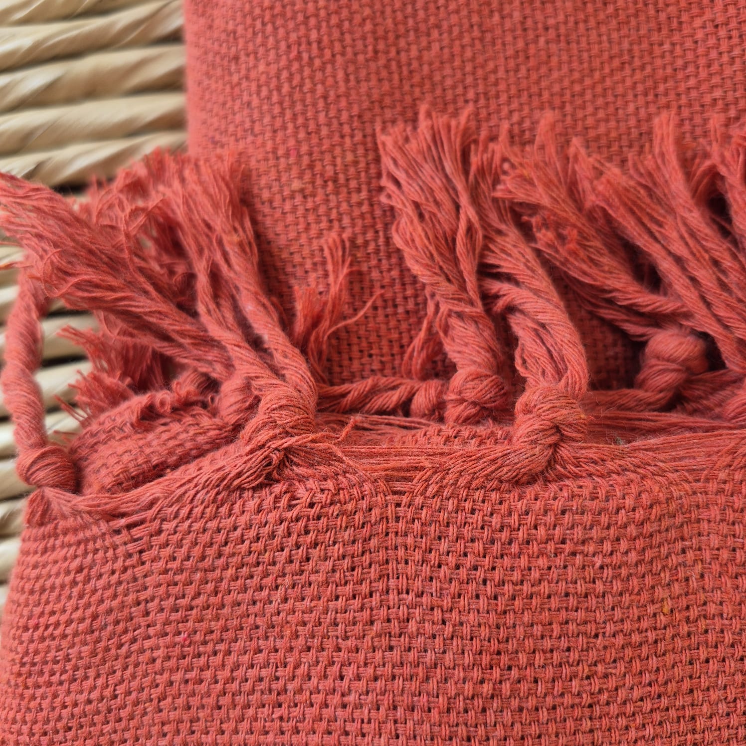 As franjas com nós são feitas a mão por artesãos, proporcionando resistência para não desfiar e ao mesmo tempo delicadeza.