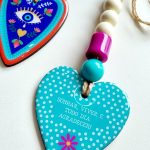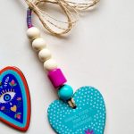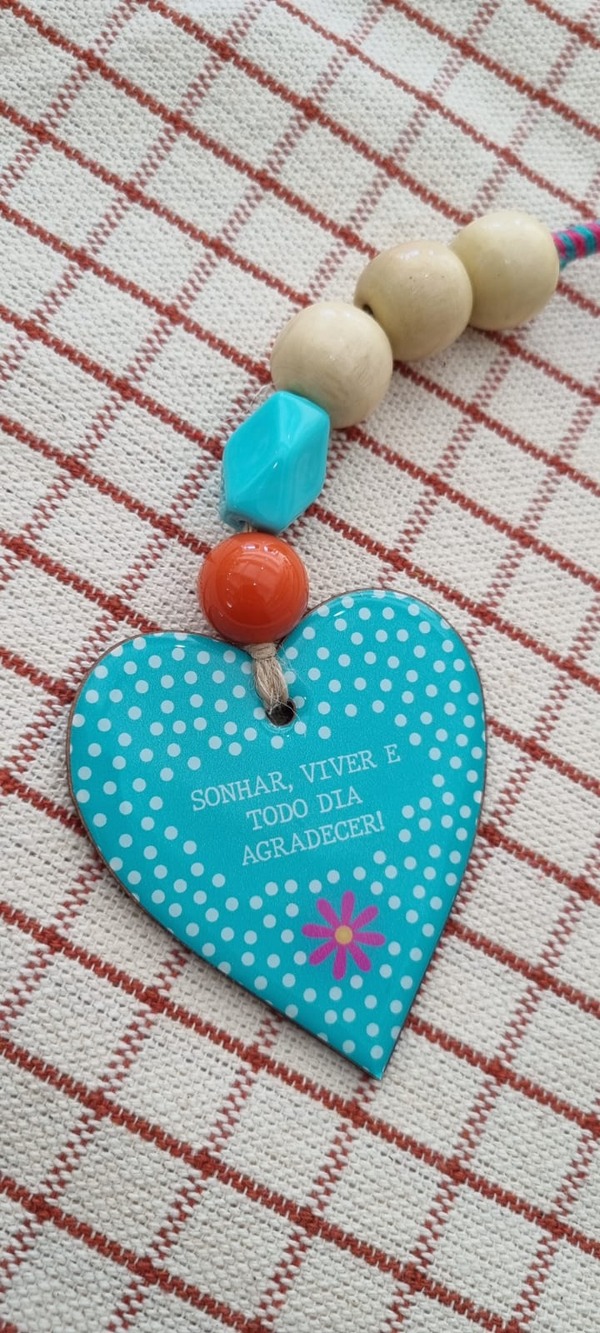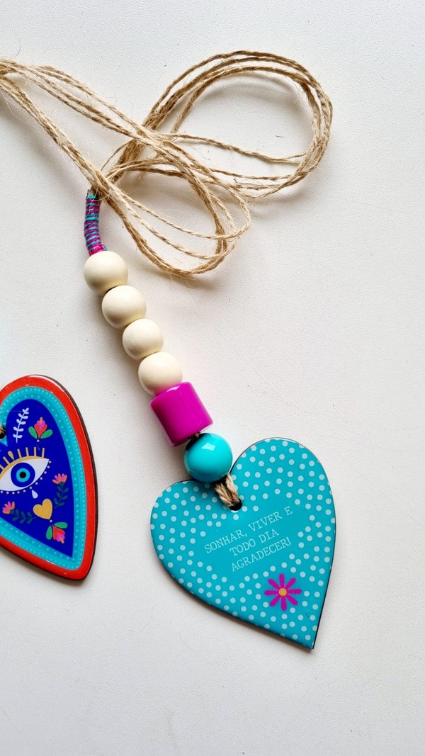 Pingentes de MDF resinados amarrados com barbante e contas coloridas.