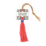 Pingentes de MDF resinados amarrados com barbante e contas coloridas.