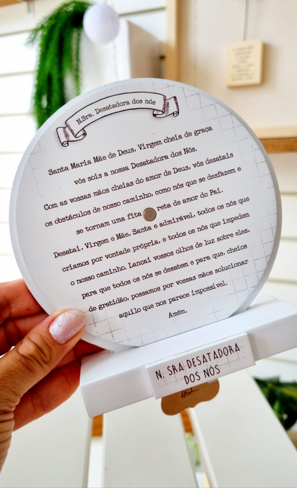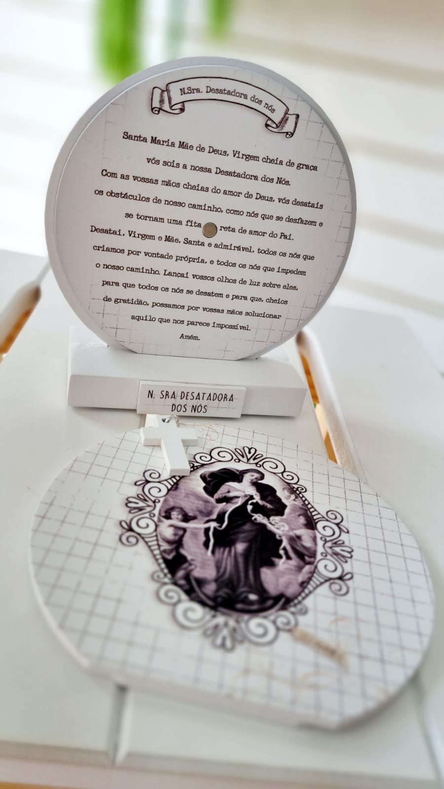 Relicário de mesa com imagem da Nossa Senhora Desatadora dos Nós na frente; você puxa a parte da frente e ela sai – dentro está a oração! Para recolocar, é só encostar uma na outra que as peças de imã se fixam uma à outra. Mais do que objetos, os produtos religiosos são símbolos que unem fé, beleza e significado.