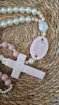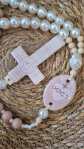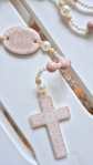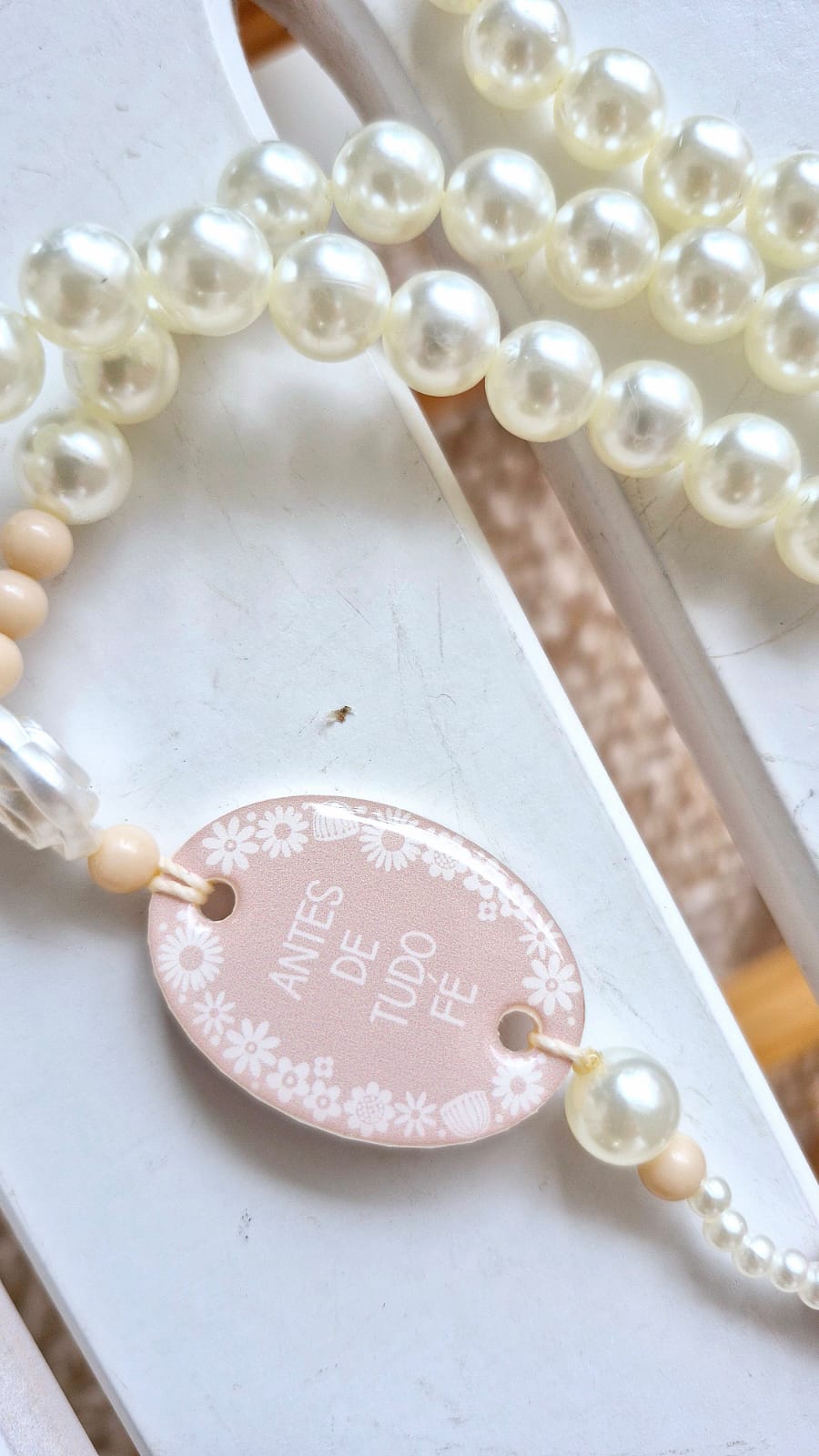 Acessório com crucifixo em MDF resinado, contas de madeira e miçangas coloridas. Nossos TERÇOS e DEZENAS tem mensagens de fé e devoção que vão te encantar.